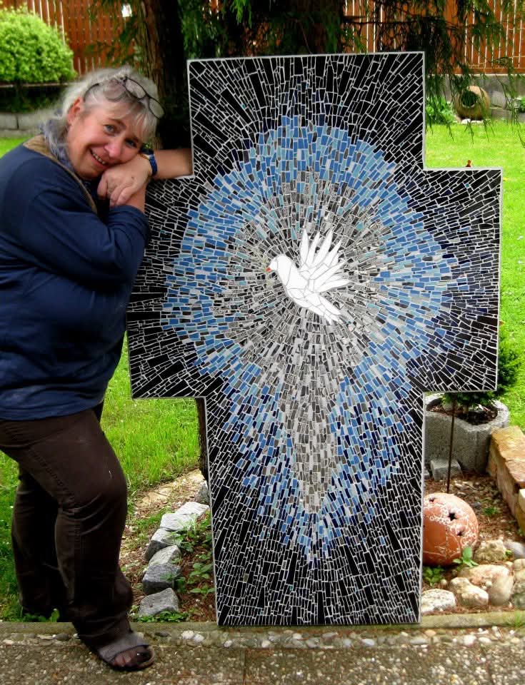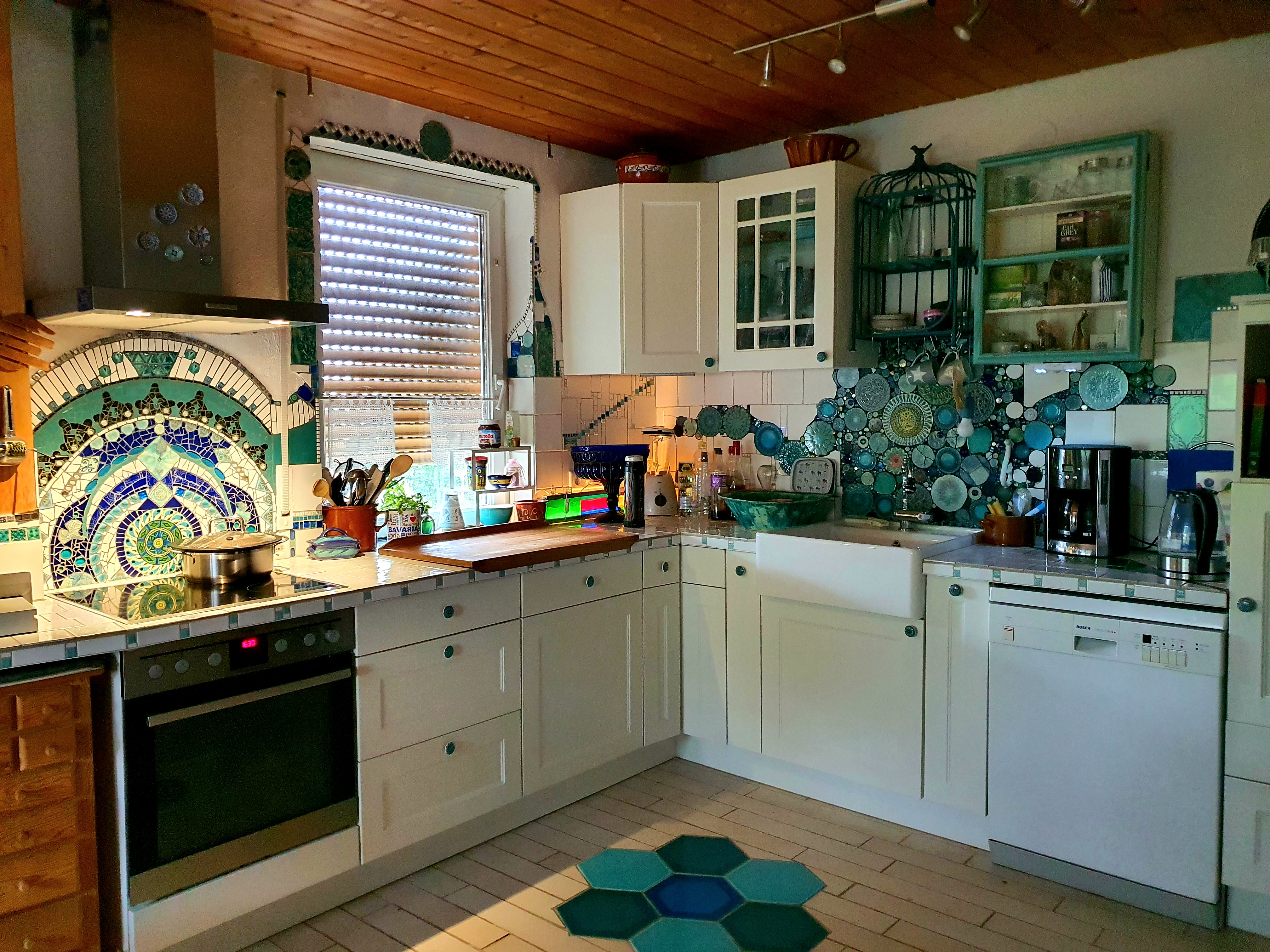 Mit Mosaikkunst wird ein Haus zum Schmuckstück – egal, ob durch Bilder, Schalen, Blumentöpfe, Kellerabgänge oder sogar auf den Küchenarbeitsplatten lässt es sich gut verlegen. Hier passt ein guter Spruch von mir, alles was man nicht verbergen kann, z.B. Mauervorsprünge, oder Risse und Spalten am Haus kann man mit Mosaik überarbeiten. Wohnungsdurchbrüche genauso, wie Bäder, wo man teilweise die alten Fliesen recyceln und als Mosaik gemischt mit anderen Farben wiederverwenden kann.